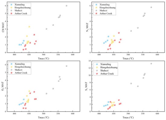 In order to expand the response range of MAT parameters, lacustrine Shahezi and marine Arthur Creek samples with different maturities were added for comparison with the Xiamaling and Hongshuizhuang Formations in this research. It can be seen that, from the immature to high–over mature stages, the Tmax and MAT of CH, O1, N1, and S1 compounds were positively correlated, but the correlation coefficient and dispersion degree of the four formations were different, which may be related to the different precursors of organic matter (Figure 17). Compared with CH, N1, and O1 compounds, the MAT of the S1 compounds showed a relatively weak linear relationship for Mesoproterozoic source rocks. According to the analysis of the composition and abundance of the S1 compounds, there was a difference in the distribution of organic sulfur between different maturities, which may have been influenced by the input of inorganic sulfur. Considering the stable reductive sulfidation environment in the Mesoproterozoic, inorganic sulfur may have entered into sulfur-containing compounds via bacteria and algae in the anti-carboxylic acid cycle or via sulfate and pyrite in solid media. This indicates that the DBE and carbon numbers of organic compounds could reveal and quantify the thermal evolution characteristics of organic matter from different provenances and sedimentary environments.