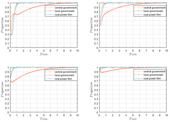 First, an increase in the initial willingness facilitated the system’s evolution toward a positive state. As shown in Figure 1, the higher initial willingness led to a faster evolutionary process, highlighting the significance of enhancing the overall initial willingness. Second, both the central government and the coal power firm stabilized simultaneously, while the local government acted the slowest. According to Figure 1, the time taken for the willingness of the central government and the coal power firm to stabilize at 1 was nearly the same and always before t = 1.5. The local government evolved toward a stable state around t = 5 or t = 10 under different circumstances. This could be attributed to the proactive role of the central government in implementing regulatory measures as a proponent of CER. Furthermore, when the system reached the optimal state, the central government’s benefits derived from GTI outweighed the regulatory costs (), thereby facilitating the quicker evolution of the central government.