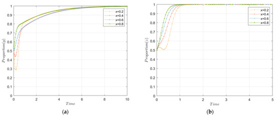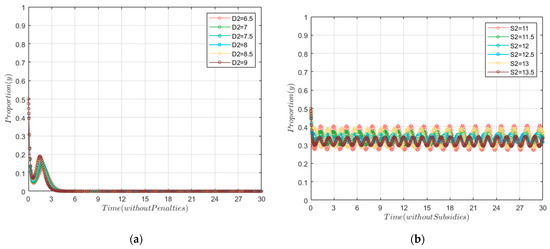 Moreover, we set and to explore the interactions between the central government S&P mechanisms, as depicted in Figure 5. First, we can see from Figure 5 that in the absence of a parallel system of S&P from the central government, the behavior of the local government always fluctuated or became passive. From Figure 5a, the willingness of the local government quickly stabilized at 0, which was a negative state. From Figure 5b, we can observe that the willingness of the local government was in a fluctuating state. The parallel implementation of S&P is a crucial safeguard to ensure the proactive actions of local government. Additionally, the effect of punitive measures seems to be more effective than the effect of subsidies. As shown in Figure 5b, the willingness of local government was fluctuating at this time but within a certain range of ups and downs, rather than being entirely negative as depicted in Figure 5a.