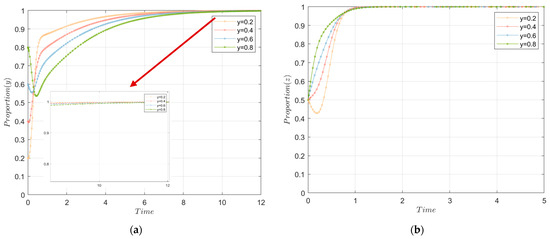 Third, we can further observe from Figure 3a that a higher initial willingness of the local government could not be sustained. Instead, it decreased and remained lower than the case with a lower initial willingness for a period. As shown in Figure 3a, when = 0.6 and 0.8 (the initial willingness of the local government), y decreased rapidly and then increased with time. However, for cases where ≥ 0.6, the value of y was lower than where < 0.6 when t > 0.33. This is because the local government required more preparation in the early stages, and the initially higher implementation intent may have certain implications for the subsequent sustained development. The local government may need to lower their willingness and provide a certain buffer.