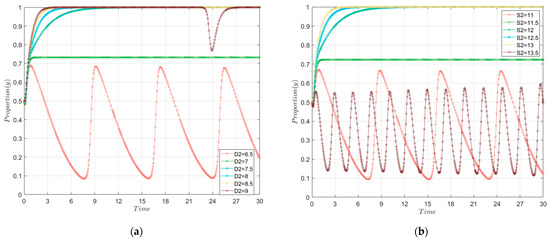 To explore the effect of the central government S&P, and were set to six values with 0.5 gradient. That is, varied from 6.5 to 9, andvaried from 11 to 13.5. The evolution of the local government is shown in Figure 4. Figure 4 shows the evolution of the local government’s willingness (y-axis) over time (x-axis) under the influence of the central government S&P. Comparing Figure 4 with Figure 2a, it can be seen that the change in the central government’s S&P intensity had a greater impact on the local government than the change in the central government’s initial willingness.