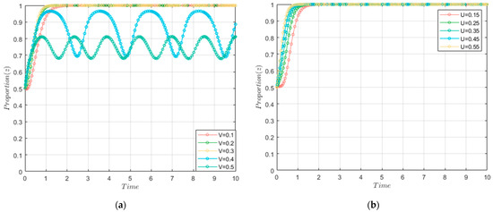 First, increasing the intensity of the local government S&P will accelerate the coal power firm’s evolution. As shown in Figure 6, when V increased from 0.1 to 0.3, the decision-making time of the coal power firm was shortened. Additionally, we can also notice that the evolution time of the coal power firm shortened with the increase in U. This was because subsidies alleviated the financial burden on firms engaging in GTI, while penalties intensified the repercussions of excessive ECE. Yin et al. (2020) [49] also had a similar conclusion.