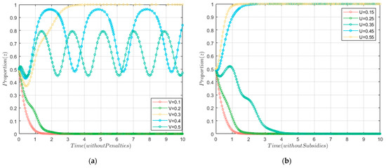 Furthermore, we set V = 0 and U = 0 to examine the interaction between the local government’s S&P mechanisms, as depicted in Figure 7. We noticed that lower-intensity S&Ps still required integration, while higher-intensity S&Ps may also yield certain effectiveness. We can see that the willingness of coal fired power firms rapidly stabilized at 0 and remained in a negative state when V ≤ 0.2 or U ≤ 0.35. The results demonstrated that without a parallel system of S&P implemented by the local government, the behavior of the coal power firm fluctuated or became passive when subsidies or penalties were low. Moreover, the willingness of the coal-fired power firm eventually stabilized to 1 when V = 0.3 or U ≥ 0.45. Only when there was a high intensity of S&P did enterprises exhibit positive behavior. This was different from the performance of the local government, indicating that coal power firms had a stronger willingness.