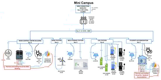 | Building | Electrical Peak Load (kWel) | Thermal Peak Load [kWth] | Cooling Peak Load [kWcool] |