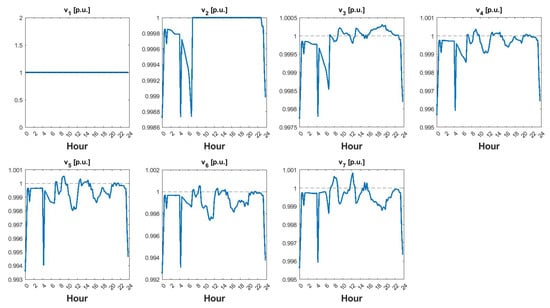 - Case considering E-mobility: Active and reactive power flowing across different busses in the microgrid are considered here with E-mobility. On a typical summer day, the microgrid exhibits a dynamic and adaptive energy distribution pattern, as illustrated by Figure 5. During daylight hours, the availability of sunlight allows the PV system to significantly contribute to the power supply, covering a substantial portion of the energy demand. The CHP unit efficiently operates during the day due to the request from the grid to satisfy the load and at night when solar power is unavailable. As the sun sets, the graph reveals a shift in energy sources, with a notable presence of the CHP unit and an increasing contribution from the grid. Interestingly, the demand for electric mobility charging emerges, either directly from the grid or supplied by the CHP unit at night. An interesting trend can be seen for the reactive power request: photovoltaics are supplying reactive power services even at night, with significant contributions from CHP and some from the wind turbine for the reactive power request.