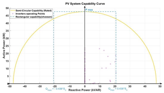 - Renewable energy source (RES) model: In our model, we consider the contribution of the RES to the microgrid system. The active power output of the RES at different buses is denoted as in kilowatts [kW] as in (1), where b denotes the generic bus, r denotes the generic source, and t denotes the time interval. Additionally, the active power curtailment of the RES is represented by in [kW] as in (2), reflecting any reduction in the output due to operational or grid constraints. represents the available power of the RES as in (3). The Equation (4) limits the maximum power of the RES according to (CEI 0-16 page-117). The main constraints for RESs are as follows:For the reactive power, in (5) represents the inductive reactive power injected into the microgrid by the RES in [kvar], while in (6) represents the inductive reactive power absorbed by the RES in [kvar]. in (5) and (6) limits the inverter operating points, considering a rectangular capability curve. Binary variables in (7) and take the value of 1 when the RES injects or absorbs reactive power, respectively. The reactive power constraints are given as follows:These variables play a crucial role in capturing the dynamic behaviour and impact of the RES on the microgrid, enabling an analysis of active and reactive power interactions, as well as the ability to curtail active power output when necessary.
