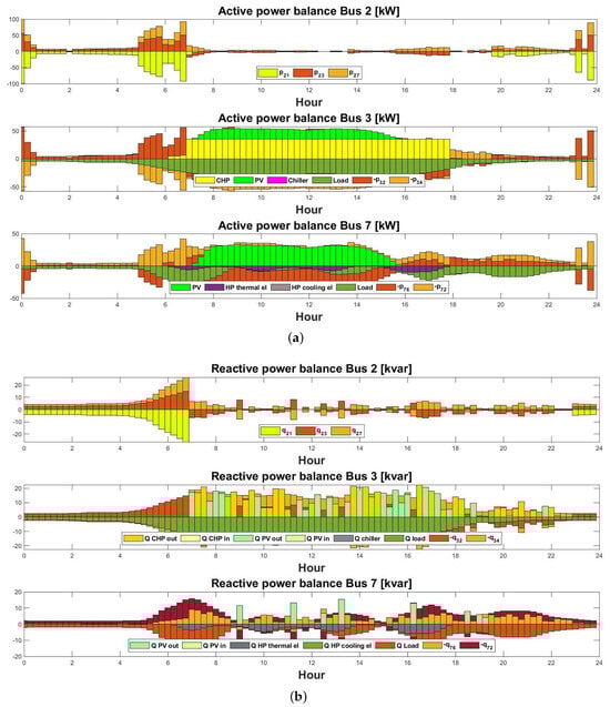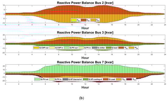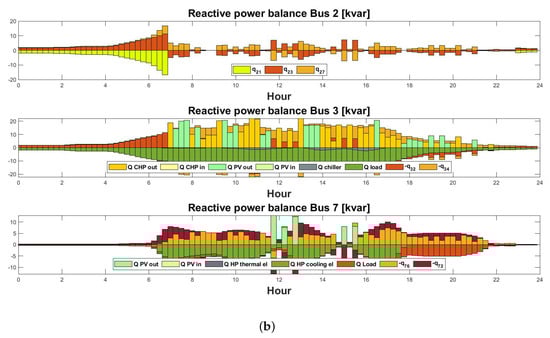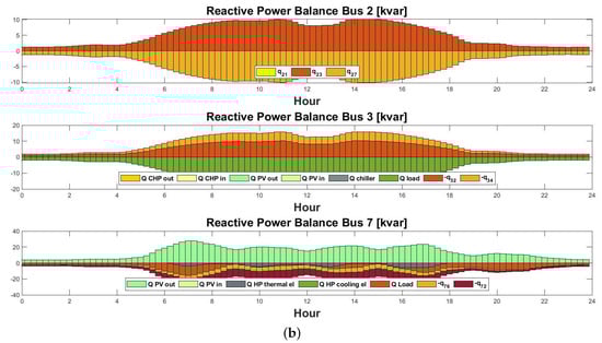 - Case without considering E-mobility: In the scenario of a typical winter day without E-mobility, the load request experiences a reduction, and predominantly, the active power demand is met solely by the RES. During periods of RES unavailability, the deficient portion is bought either from the external grid or generated by the CHP system. On the other hand, the provision of reactive power is managed by on-site RESs or other technologies present in different buses. Active and reactive power flowing in different buses are shown in Figure 15 (a) and (b) respectively.