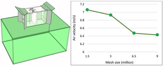 Grid adaptation needed to be performed in order to guarantee that the outcomes were not influenced by the grid’s size. Consequently, various computational models were evaluated, each possessing the same boundary conditions but utilizing a distinct grid number ranging from 1.5 million to 9 million. Figure 2 illustrates the average value of the airflow entering the chamber along the vertical line within the windcatcher inlet channel as the grid size increased from 1.5 to 9 million. The position of this vertical line in the center of the inlet channel is illustrated in Figure 2 (left). This value served as an error indicator. Given the negligible disparity (less than 1%) between the medium and fine mesh sizes, conducting additional simulations utilizing a finer mesh had no impact on the obtained results. Hence, the model possessing a mesh size of 6.5 million was sufficiently accurate to execute simulations with precision.
