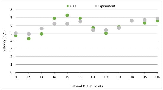 A comparison between the experimental and CFD results is illustrated in Figure 3. Comparing the CFD results with the experiment point by point for the inlet and exhaust of the model revealed that in the majority of instances, the predicted results followed the experimental trend and there was adequate adaptation at the majority of the points except point I5, which had a 15% difference. The observed variation at I5 may be attributed to the inherent limitations of k-epsilon turbulence models, specifically in situations involving separation and complex flows.