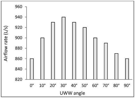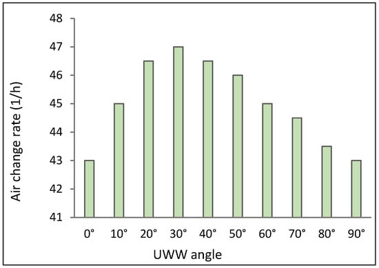 The airflow rate and the air changes per hour (ACH) are prominent parameters in the assessment of ventilation efficiency since they directly contribute to indoor air quality and occupants’ health issues. The variations in the airflow rate with respect to the UWW angle are presented in Figure 4, which shows that the variation trend was not monotonic. It increased to some extent and dropped after reaching a peak when the angle was 30°. Considering the airflow rate value of 860 L/s (for the horizontal UWW) as the reference case, the wing wall with an angle of 30° increased the airflow rate by 9%. The values of the airflow rate increased from 860 L/s for the 0° angle to 940 L/s (peak angle) and decreased to reach the value of 860 L/s for the 90° angle, which was the same as the reference case. It is worth mentioning that the airflow rates were much higher than the value of 94 L/s recommended by the ASHRAE 62.1 standard [41] for all angles.