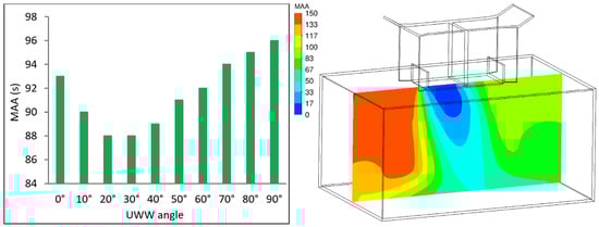 To provide deeper insight, the distribution of the MAA in the vertical cross-sectional plane of the building in the presence of the 30° UWW is shown in Figure 6 (right). According to the figure, three regions with different MAA distributions were seen inside the room. The region that was covered by the high-velocity jet entering the room had the lowest MAA values, especially at the core of the jet. The region next to the windward wall of the room had the highest values (146 s), while the region near the leeward wall experienced fresher air and possessed lower values. The distribution of the MAA was compatible with the flow field pattern since the deflection of the guided jet toward the leeward wall resulted in increased MAA values in the region in close proximity to the windward wall, especially in the upper corner.