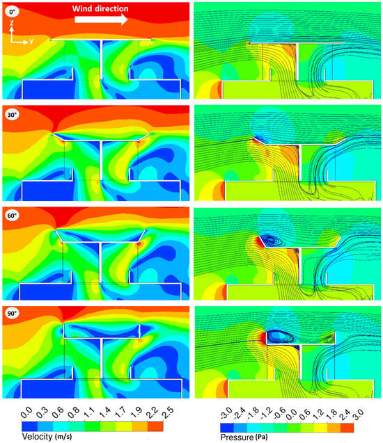 To provide deeper insight into the impact of the integration of the UWW with the windcatcher on ventilation and the pattern and distribution of flow, a qualitative analysis with the help of contours (velocity and static pressure) and streamlines is discussed in this subsection. Contours of the velocity magnitude and static pressure accompanied by streamlines of the flow inside and around the windcatcher are presented for UWW angles of 0°, 30°, 60°, and 90° in Figure 7. These four angles were selected to visualize the flow behavior for these angles and to reveal useful information about the reasons for variations in the ventilation parameters. The angles of 0° and 90° are the minimum and maximum angles, respectively. The tilt angle of 30° is the optimal angle (according to the ventilation parameters in the last section), while 60° is the middle angle between 30° and 90°. The other objective of this part is to explore why the configuration with a 30° UWW performed better than the others.
