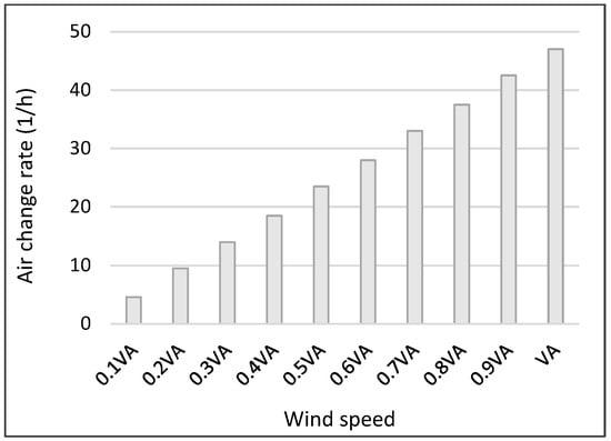 As the upstream wind speed increased from to , the kinetic energy of the airflow also increased and influences the amount of fresh air that passed through the inlet of the windcatcher. The airflow rate ranged from 92 L/s (corresponding to 0.1) to 940 L/s (corresponding to ). For all upstream wind velocities higher than 0.1, the windcatcher with the optimal UWW angle was able to provide an airflow rate much higher than the recommended value of the ASHRAE 62.1 standard, which according to the size and number of occupants in this case was 94 L/s [41]. The minimum supplied airflow rate, which occurred at 0.1, was just 2 L/s lower than the reported value of the stated standard. This shows that a windcatcher-based natural ventilation system can meet the minimum ventilation requirements, even in low-wind-speed conditions. The considered windcatcher was capable of providing the building with maximum and minimum ACH values of 47 and 4.6 with approaching wind speeds of and 0.1, respectively.