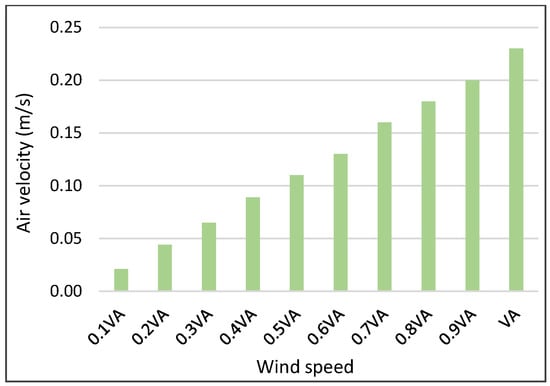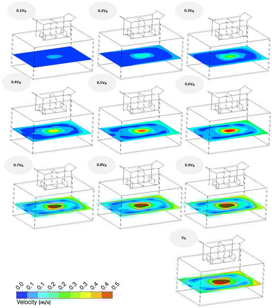 The contours of the velocity magnitude in the horizontal plane positioned at a height of 1.1 m when exposed to different wind speed conditions are presented in Figure 10, while the corresponding average values are reported in Figure 11.