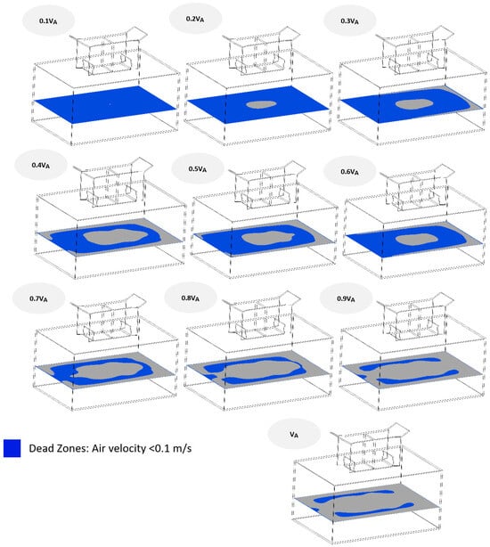 Dead zones are defined as the regions inside a building with an airflow velocity lower than 0.1 m/s [42]. The areas covered by dead zones are critical since in these regions the air becomes nearly stagnant and the danger of contaminant accumulation increases, which can lead to health issues and human discomfort. The formation of dead zones at the head height of a seated individual (plane standing at a height of 1.1 m) is of great importance since the air quality at this height has a direct impact on the occupant’s respiratory system. Figure 12 illustrates the dead zones at the breathing height of a seated occupant inside the room ventilated under different wind flow speeds.