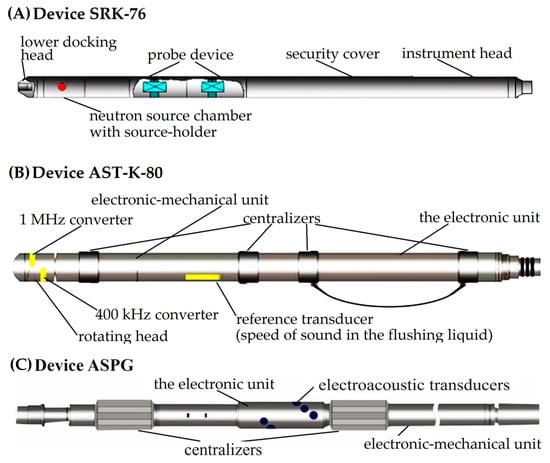 Designs of SRK-76 for neutron logging (A), AST-K-80 (B) and ASPG for acoustic logging (C) (made by Authors).