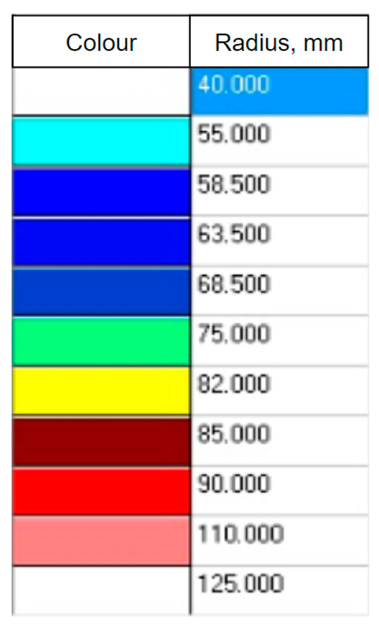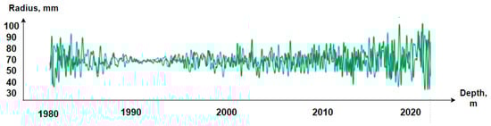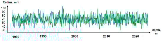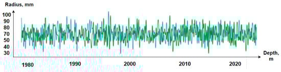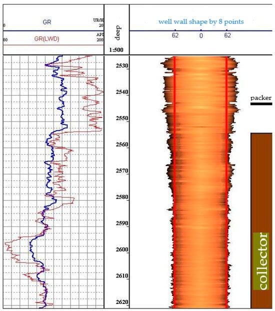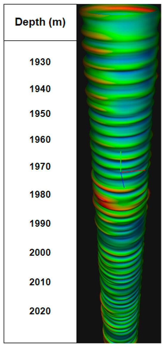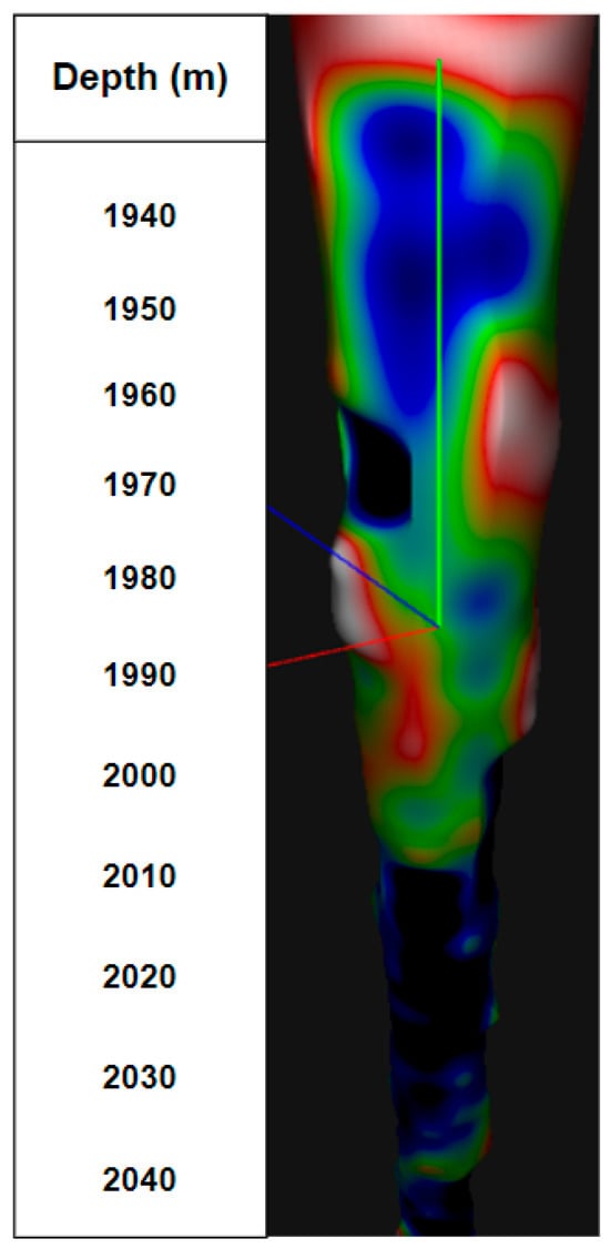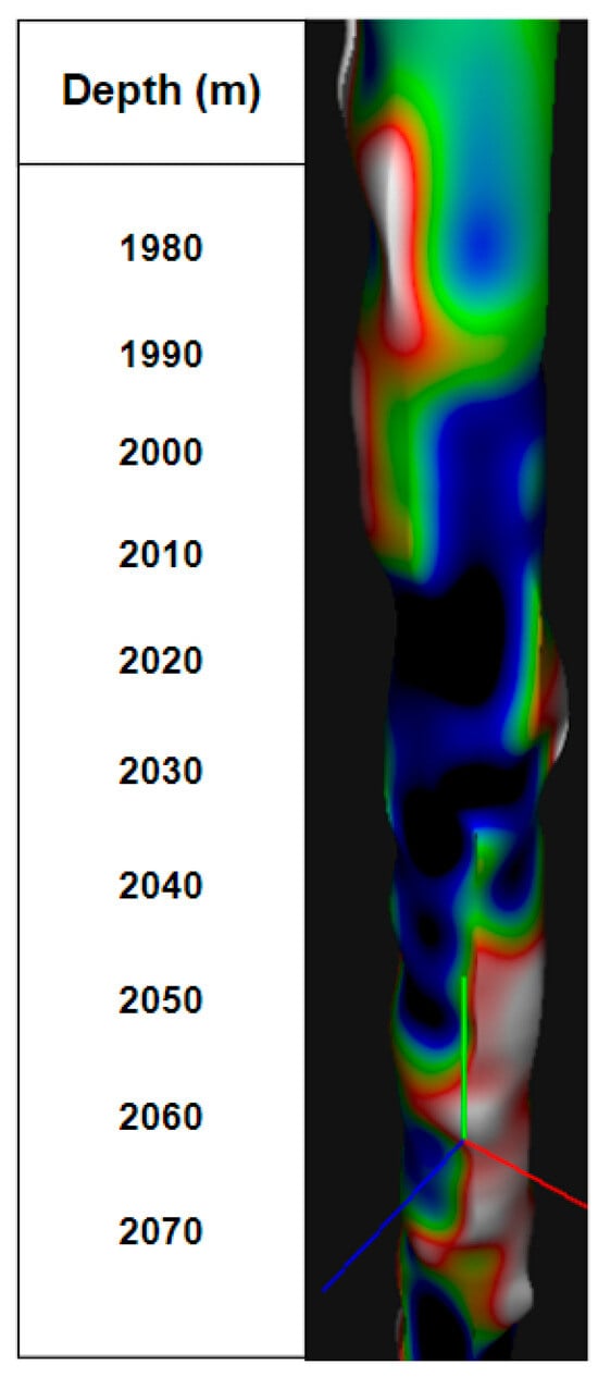 To build a future visual 3D model of a well, it is necessary to obtain the radii of the wellbore. In relation to acoustic logging, the radii are calculated for eight channels (radiation frequency 500 kHz), the speed of sound in the drilling fluid and the known distance from the axis of the device to the radiating surface of the electroacoustic transducer. On the right side in the column in Figure 2, an image of the well wall is constructed. The results of using the logging devices include the values of the radioactive logging data (along with the average, minimum and maximum diameters of the well), presented in the left part of Figure 2. The results of acoustic logging (well profile) are presented in the right part of Figure 2.