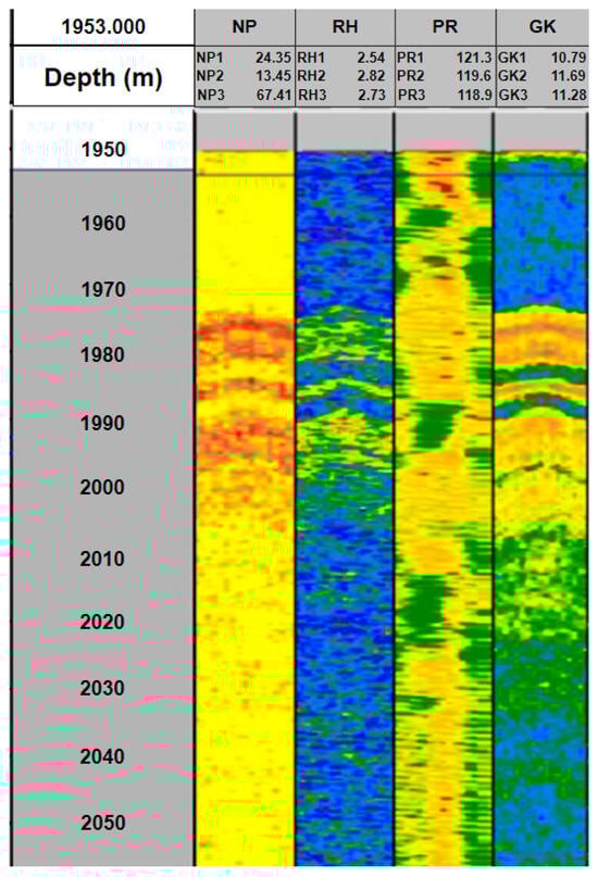 An example of a volumetric model for the types of logging described above (from left to right: column NP presents azimuthal data of neutron gamma ray logging; RH—azimuthal data of density gamma–gamma ray logging; PR—azimuthal data of acoustic logging; GK—azimuthal data of gamma ray logging).