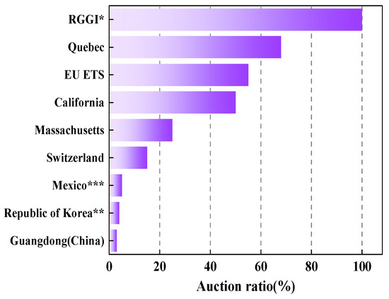 What are the key future challenges facing the power sector? The primary challenge lies in the transition from free allocation to auction allocation as the method of carbon allowance distribution [6]. Under the guidance of the Chinese government, seven carbon trading pilot schemes including Guangdong were launched in 2011. Like the real-time multi-energy market, power generation companies of different scales and technologies will also take turns bidding for carbon quotas in the carbon market to obtain them. In the end, auction transactions are carried out based on the carbon quota subscription and bidding quantities of multiple enterprises, with the highest bids becoming successful [7]. However, to consider the economic pressure of incorporated enterprises (power generation enterprises) in these carbon trading pilot projects, only Guangdong Province started the earliest attempt at a carbon allowance auction with the auction ratio set at 3% in China. Although the auction proportion of carbon allowance in Guangdong Province has risen to 5% by 2019, there is still a considerable gap compared with the more mature carbon market abroad. According to the ICAP Status Report (2019) and HER’s report, most carbon emission trading systems in the world have started to auction carbon quotas or intend to introduce an auction mechanism (as shown in Figure 1). Among them, the United States Western Climate Initiative (WCI) and the Regional Greenhouse Gas Initiative (RGGI) regularly auction quotas, and the auction ratio is set at 100%. The European Union Carbon Emissions Trading System (EUETS) also sets the auction ratio at nearly 60% and plans to achieve more ambitious emission reduction targets with a higher auction ratio in the third stage of the carbon trading market. On the one hand, China aims to promote international trade in a more environmentally friendly manner with the introduction of the carbon border tax. On the other hand, to fulfill emission reduction responsibilities and achieve a dual carbon target, the construction of a carbon market aligned with international standards becomes crucial. This involves gradually adopting measures such as compensated allocation of quotas and increasing auction ratios. These are important issues that need urgent consideration [8].