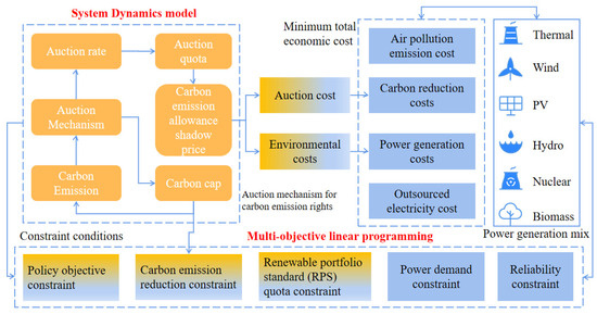 Based on the theory of mathematical dynamic systems, this paper utilizes the SD model to simulate the electric carbon market under the carbon allowance auction mechanism. The objective is to depict the shadow price of carbon emission rights under different ratios of carbon allowance auctions. In comparison to other models, the SD model offers several advantages such as requiring less data, considering multiple influencing factors, and being dynamic. The interaction between the carbon allowance auction mechanism and the electricity carbon market is profound and multidimensional, making the SD model particularly suitable for studying the actual value of carbon emission rights in complex environments. The impact of the carbon allowance auction mechanism on the power generation mix is transmitted to the power generation structure through auction costs and environmental costs on the one hand, and through carbon cap on the other hand, which affect the production activities of electricity generation, such as the carbon emissions generated by thermal power generation. Using a multi-objective linear programming model, this study constructs a complete power generation structure optimization model based on the auction ratio to minimize the total economic cost, and its research framework is designed as follows (Figure 2):