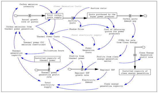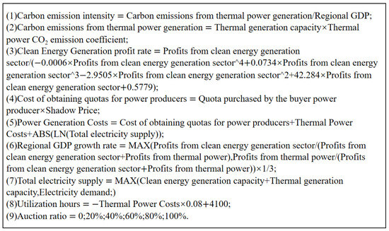 This paper employs a system dynamics model to estimate the actual price of carbon emission rights. The carbon emission rights pricing model is developed based on the auction ratio, specifically focusing on the electric carbon market and the incorporation of carbon quota auction ratios [25]. Two key assumptions are considered as follows: (1) Carbon emission caps are allocated below the total carbon emissions of the power generation sector to enhance the emission reduction effectiveness of the carbon trading market. (2) The primary source of profit for the clean energy generation sector is measured by the sale of Chinese Certified Emission Reductions (CCERs). Figure 3 presents the carbon emission rights pricing model, comprising a stock-flow diagram and a mathematical–logical relationship equation derived through diverse methodologies. The carbon emission rights pricing model was constructed based on the carbon allowance auction mechanism and the overall operation of the power industry. Using a combination of qualitative description and quantitative research, the stock flow diagrams for the simulation model are shown in Figure 3.