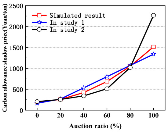 Figure 5. Shadow price of carbon allowances under different auction ratios.
