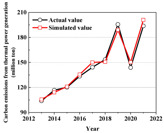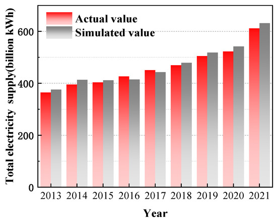 - Through the sensitivity analysis, the Output results of the simulation model of the electric carbon industry based on the carbon quota auction ratio passed the test and proved the accuracy, and the simulation values of some of the variables could not be compared with the historical values, so the data results from similar studies were chosen to compare with the simulation values. By comparing with existing studies [24,31], it is found that the simulation results of the model on the shadow price of carbon allowances are reasonable under different auction ratios. The shadow prices of carbon allowances under different auction ratios are shown below (Figure 5). Comparing with similar studies and the transaction prices under the carbon allowances auction ratio at 60% in EUETS, it can be observed that the pricing model constructed in this study exhibits higher accuracy and smaller deviation in terms of the auction transaction prices in established carbon markets (Figure 6). There are many methods for model sensitivity analysis, and this research mainly adopts the methods of scene analysis and historical data comparison. As shown in Figure 7 and Figure 8, we selected three variables from the model and conducted an error analysis on these three variables. These three variables are the shadow prices of carbon allowances under different auction ratios, the total electricity supply, and carbon emissions from thermal power generation, respectively. We observed the absolute errors between the simulated values and the actual values of these variables from 2013 to 2021, further validating the effectiveness of the model. By comparison, the maximum absolute errors for these three key variables are all within 5% to 10%, falling within an acceptable range. This verifies the sensitivity of the model to past events and indicates the reliability and credibility of the simulation results of the carbon emission rights pricing model.
