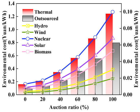 - The environmental cost is measured by Equation (5) and presented in Figure 9. It can be found that the environmental cost of thermal power generation and outsourced electricity increases the most as the auction ratio grows, while the maximum environmental cost of other energy generation technologies does not exceed 0.1 Yuan/kWh.