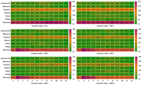 After the introduction of the carbon allowance auction mechanism, this paper optimizes the power generation structure to minimize the total economic cost and finally obtains the output results with the time scale of months, as shown in Figure 10. From the heat map, when the auction ratio ascends from 0% to 100%, power generation by thermal power and nuclear power contribute a higher share of the amount of power generation. In terms of months, when the auction ratio is 100%, power generation by thermal power peaks at 52.12 kWh in February, meanwhile, power generation by nuclear power peaks at 26.55 kWh in December. In other words, to ensure that the total economic burden of the power generation industry is minimized, when the carbon allowance auction mechanism is aligned with the international carbon market in the future, each month thermal power and nuclear power generation should prepare at least 52.12 kWh and 26.55 kWh of stabilized power supply.