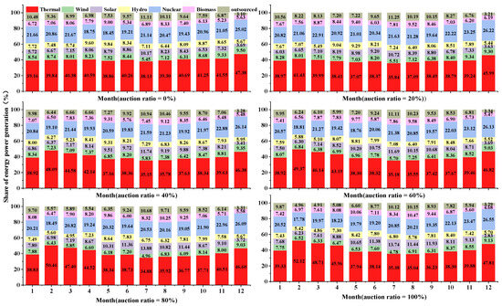 Share of energy power generation in different months under different auction ratios of carbon quotas.