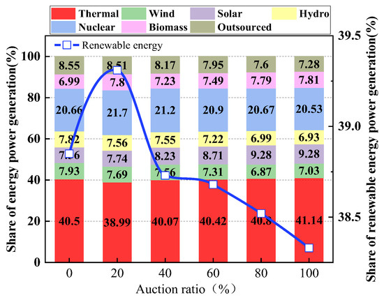 The power generation structure and share of renewable energy power generation under different carbon quota auction ratios at the annual level.