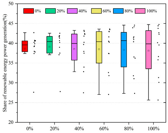 It can be observed in Figure 12 that the proportion of electricity generated from renewable sources does not exhibit a consistent increasing trend as the auction ratio rises. With the auction ratio increasing from 0% to 20%, the share of electricity generated from renewable energy sources increased by 0.46%; however, when the auction ratio was further raised from 20% to 100%, the share of electricity generated from renewable sources declined by 0.98%. Furthermore, in conjunction with Figure 13, the monthly data on renewable energy generation reveals that the average share of renewable electricity generation is higher when the auction ratio is set to 20% or 80%. When the auction ratio is 0%, the proportion of renewable power generation is more concentrated each month, and the distribution of the share of renewable power generation gradually becomes more dispersed as the auction ratio increases. Notably, at auction percentages of 0%, 20%, and 40%, the corresponding box plots appear as outliers, attributed to the more concentrated distribution of the share data at the median level of 40%. As depicted in Figure 12 and Figure 13, the annual share of renewable power generation exhibits a slight downward trend when the auction ratio exceeds 20%, while the fluctuations in the changes in the monthly share of renewable power generation tend to stabilize.