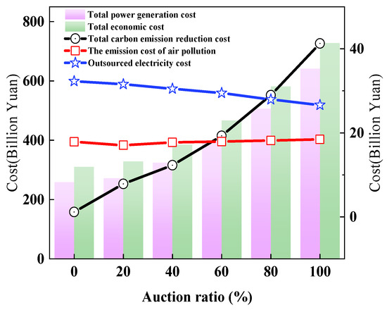Figure 14 presents the trends of various costs under different auction ratios. As the auction ratio grows, the total power generation cost shows an obvious growth trend, and the total carbon emission reduction cost also shows a dramatic growth trend, yet the change in the air pollution emission cost is relatively moderate, and the cost of outsourced power even shows a decreasing trend. Further analysis of the modeling results reveals that the air pollution emission cost is mainly bound to the pollutants generated by thermal power generation and biomass power generation, while the results from Figure 12 show that with an increase in the auction ratio, the range of the share change in thermal power generation is from 38.99% to 41.14%, the range of the proportion change in biomass power generation is from 6.99% to 7.81%, and the fluctuation of the changes is not particularly drastic; therefore, the corresponding cost of air pollution emissions will not change particularly significantly. The reason for the decrease in the cost of outsourced electricity is mainly due to the requirement to prioritize power generation technologies with low unit costs under the constraint of minimizing the total economic cost. When the auction ratio is increased from 0 to 60%, the unit cost of outsourced electricity is higher than the unit cost of thermal generation in all cases, by 41.4%, 34.9%, 22.3%, and 9.3%, respectively. Even when the auction ratio is set to 80% and 100%, the difference between the unit cost of outsourced electricity and thermal power generation is only 0.02 and 0.15 Yuan/kWh, so the total economic cost can be minimized by the reduction in outsourced electricity purchase.