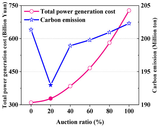 The total economic costs and carbon emissions under different carbon allowance auction ratios.
