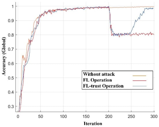 In this work, we conducted a comprehensive evaluation of the novel ANN-based FL-trust mitigation system. This innovative approach was meticulously compared to the conventional FL control method currently in use. The research findings, summarized in Figure 5, provide a compelling visual representation of the comparative performance. The figure exhibits four zones. Initially, iterations 0 to 150 illustrate the system’s startup operation. Subsequently, from iteration 150 to 200, the normal operation of the system is represented. Following that, from iteration 200 to 250, the detection of the continuous poisoning attack occurring after iteration 200 by FL-trust is demonstrated. Lastly, iterations 250 to 270 denote the operations of FL-trust to mitigate the attack.