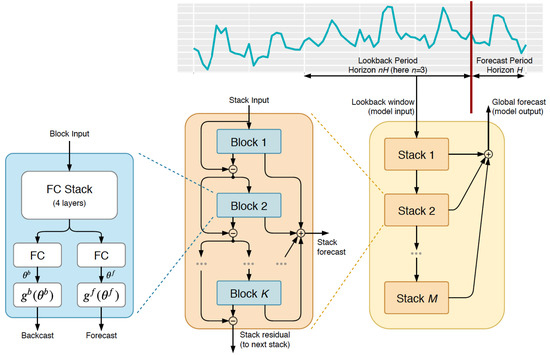 As shown in Figure 1, the NBEATS model consists of a sequence of stacks, where each stack contains K blocks that are connected by a doubly residual architecture. A given block l has one input and two outputs: the backcast and the partial forecast . In the initial block, we set , where denotes the model-level input. We define the k-th fully connected layer in the l-th block, having ReLU non-linearity, weights , bias , and input , as . In the configuration that shares all the learnable parameters across blocks, NBEATS is described as follows [15,43]: