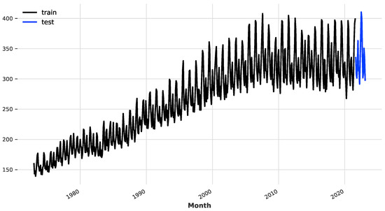 To evaluate the effectiveness of the proposed model, we compare it to several standard deep learning and statistical models. Specifically, we consider the RNN, GRU, LSTM, ARIMA, TCN, and XGBoost models. The dataset used for the experiment is the total monthly electricity production in the US from January 1973 to February 2023. As shown in Figure 3, the time series is split into training and testing sets, where the last 18 months are allocated as the testing set. The complete code for the numerical experiments is provided on GitHub at https://github.com/group-automorphism/zero-shot-energy-forecast.(accessed on January 12 2024).