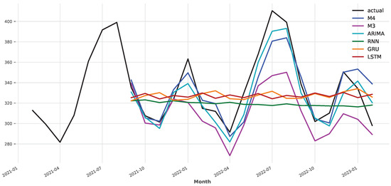To obtain a better glimpse of the model performance, we evaluate each model using a 4-month forecasting horizon over the last 18 months of the test set. In other words, we backtest the models starting from the end of the training set’s period. In the case of ARIMA, we repeatedly build a training set expanding from the beginning of the series. The model is trained on the training set and a forecast is made, and the MAPE is evaluated on the forecast and the actual values. Then, the end of the training set is moved forward by 1 time step. Thus, in the first iteration, the training period for ARIMA is , while in the next iteration, the training period is , where is the number of periods in the original training set. Finally, the mean of all the MAPE scores is calculated. In the case of RNN and other deep learning models, including NBEATS, the model is not retrained at each iteration; i.e., we employ the same model as trained on the original train set. Instead, only the lookback window is moved by one time step. Thus, in the first iteration, the lookback window is , while in the next iteration, the lookback window is .