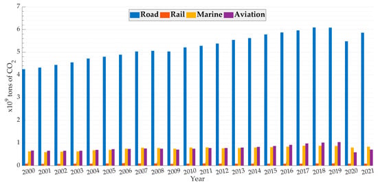 EU CO2 emissions of the primary sub-sectors within the transportation industry from 2000 to 2021.