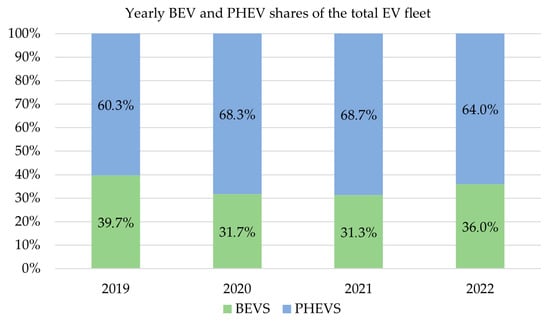 BEV and PHEV share of the total EV fleet in the Greek market from 2019 to 2022 [31].