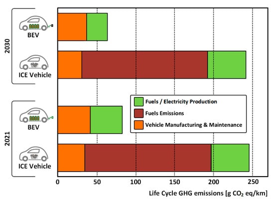 Although EVs are undoubtedly characterized by higher efficiency than conventional vehicles, their “green” character in their operational phase depends on the source of the used electrical energy [34]. Figure 3 illustrates the CO2 emissions from gasoline ICE vehicles and BEVs throughout their life cycle in Europe. The assessment of CO2 emissions is conducted under two distinct scenarios: (a) vehicles that were registered in Europe in the year 2021, taking into account the electricity mix of that year, and (b) vehicles that will be registered in the year 2030, with considerations made for the envisioned electricity mix of that future period. Moreover, CO2 emissions throughout a vehicle’s life cycle are classified into subcategories, encompassing manufacturing and maintenance, as well as fuel or electricity production and fuel emissions. Notably, the manufacturing and maintenance subcategory also incorporates battery manufacturing in the context of BEVs. The data pertain to medium-sized vehicles covering a distance of approximately 243,000 km during their life cycle [34].