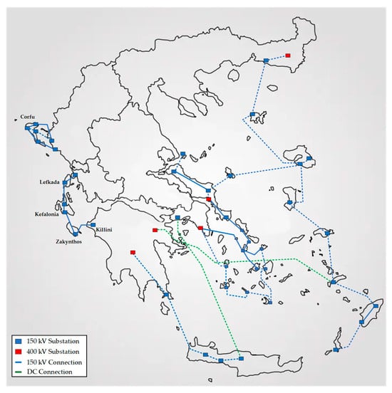 Although Zakynthos is connected to the mainland’s electricity grid through high-voltage (150 kV) submarine cables, it faces energy limitations due to its restricted capacity. Specifically, the interconnection between Killini (mainland port) and Zakynthos was initially established in the early 1980s with the installation of a 150 kV AC submarine cable. Additionally, Zakynthos is linked to the island of Kefalonia via a submarine cable of a lower nominal capacity. The total capacity of the Zakynthos distribution grid is constrained within the range of 120 to 150 MVA. This capacity is comprised of three 150/20 kV distribution transformers, each with a capacity of 40/50 MVA [36,37]. In Figure 4, the submarine interconnections of Zakynthos with the electrical transmission system of the mainland (Killini) and Kefalonia island are distinguished. Furthermore, the map depicts both existing connections (indicated by solid lines) and planned connections (indicated by dashed lines) between the mainland and the other Greek island complexes [36].