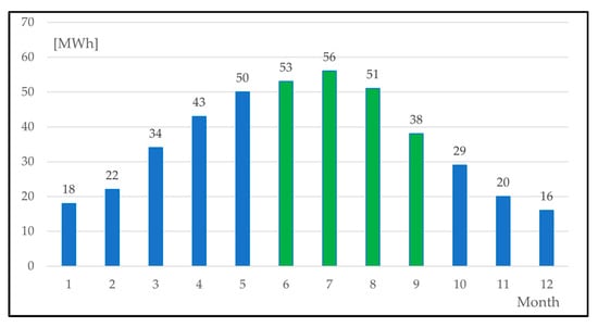 The monthly energy production of the PV system of 300 kWp is depicted in Figure 5. Considering the results of Figure 5, it is proved that the proposed PV system produces around 198 MWh during the June–September period, i.e., 46% of the required energy, while over the remaining 8 months, the PV production is equal to 232 MWh, offsetting the demand on an accounting basis within the period of high EV charging load demand.