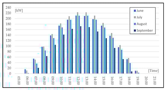 The average hourly output power of the 300 kWp photovoltaic system for the typical day of each month, covering the period from June to September.