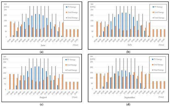 Allocation of hourly energy production for the charging of 50 EPUVs within the typical day of each month: (a) June, (b) July, (c) August and (d) September.