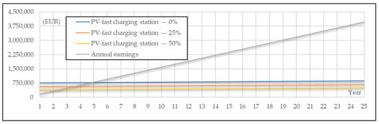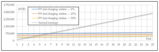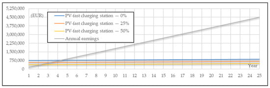 LCCA of the PV fast-charging station considering EUR 0.45/kWh charging price cost and (i) 0%, (ii) 25% and (iii) 50% investment subsidy.