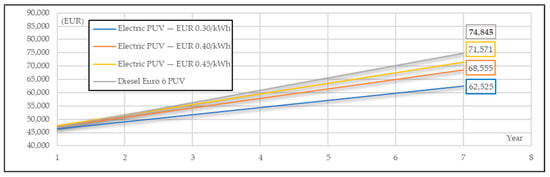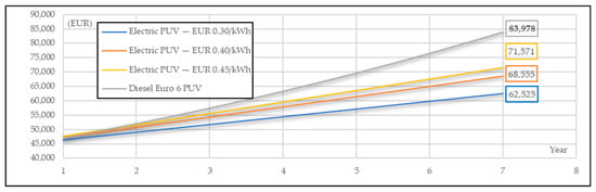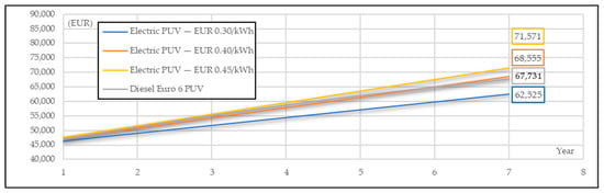 In this section, the sustainability of the EPUVs that charge their batteries from the proposed PV fast-charging station is examined compared to Euro 6 diesel PUVs. It is recalled here that this study examines the replacement of outdated PUV technology, which uses engines older than those of the Euro 6 category. These outdated public utility vehicles (PUVs) constitute the majority of taxis on the island of Zakynthos. The considered replacement options are either electric or diesel Euro 6 PUVs. It is noted that, according to European legislation, both electric and diesel Euro 6 PUVs are considered valid options for the replacement of vehicles with outdated technology. The analysis is conducted over a short-term period, i.e., 7 years, due to the uncertainty in the long-term prediction of fossil fuel prices. The comparison is conducted for the three electricity price cost scenarios (i.e., EUR 0.30/kWh, EUR 0.40/kWh and EUR 0.45/kWh) and for the three scenarios of diesel supply price. More specifically, the following diesel price cost scenarios are used: (i) constant diesel supply price (EUR 0.16/lt), (ii) 5% annual increase in diesel supply price and (iii) 5% annual decrease in diesel supply price. In the last two scenarios, the first-year diesel price is EUR 0.16/lt. In the case that the owners of outdated technology PUVs choose to replace their vehicles with new diesel Euro 6 PUVs rather than opting for new electric vehicles, an initial purchase value of EUR 40,000 is considered.