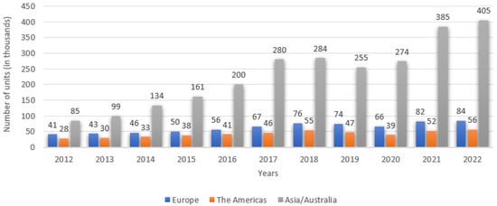 Currently, robotization is one of the main drivers of economic development in industrialized countries. According to the International Federation of Robotics [], after the global production crisis caused by the COVID-19 pandemic, which paralyzed global production and slowed down investments, a clear revival has occurred. In 2022, the operational stock of industrial robots was computed at 3,903,633 units (+12%). In Asia, there was a 38% increase in the installation of new robots, though it was slightly lower in Europe, where a 24% increase in installation levels was noted compared with the previous year (Figure 1).