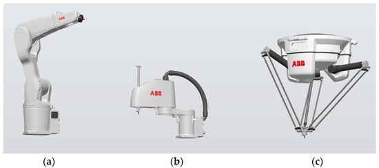 Energy-efficient robotics involves designing, manufacturing, and operating robots with the aim of reducing energy consumption and increasing efficiency []. The primary objective is to minimize the environmental impact of industrial robots by optimizing their processes and reducing electricity consumption. When reviewing the literature on industrial robotics, it becomes clear that research on energy efficiency primarily focuses on robots with an anthropomorphic structure, also known as articulated robots (see Figure 2a) [,]. These robots are the most implemented in the industry and are designed to perform functions similar to those of the human upper limbs, such as manipulative and articulated functions. Commonly encountered robots in the industry include Cartesian, SCARA (as shown in Figure 2b), and delta (parallel) robots (as shown in Figure 2c). These robots differ in their construction, operating principles, and basic technical parameters.
