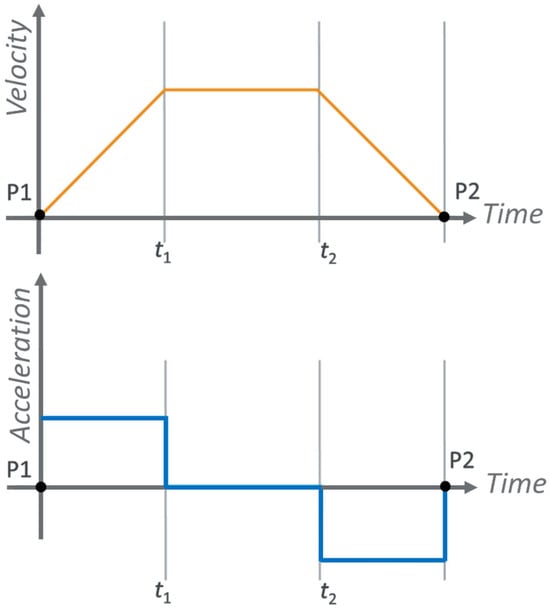 These instructions can also include precise (fine) or coarse positioning, known as approximation. The robot is required to stop at a certain point (target), which causes the motors to slow down. The energy generated by the reduction in speed is transferred to resistors and dissipated as heat. Increasingly, manufacturers are designing robots where the braking energy is recovered and fed back into the electrical grid [,]. Figure 3 illustrates the phases in the TCP motion of an industrial robot between points P1 and P2.
